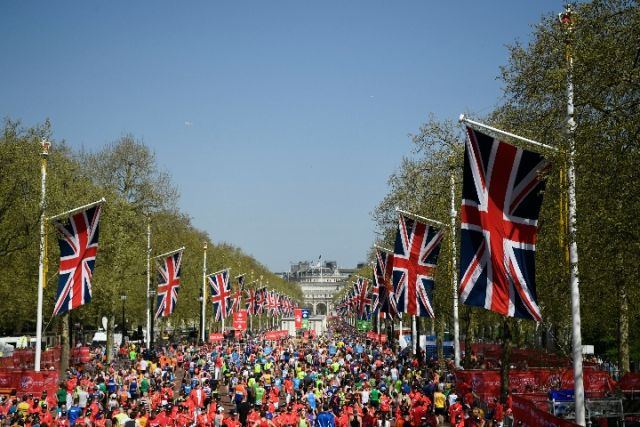 4月22日,在英国伦敦,选手参加伦敦马拉松赛。