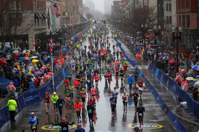 4月16日,第122届美国波士顿马拉松赛在雨中鸣枪开跑,参赛选手冒雨奔跑。