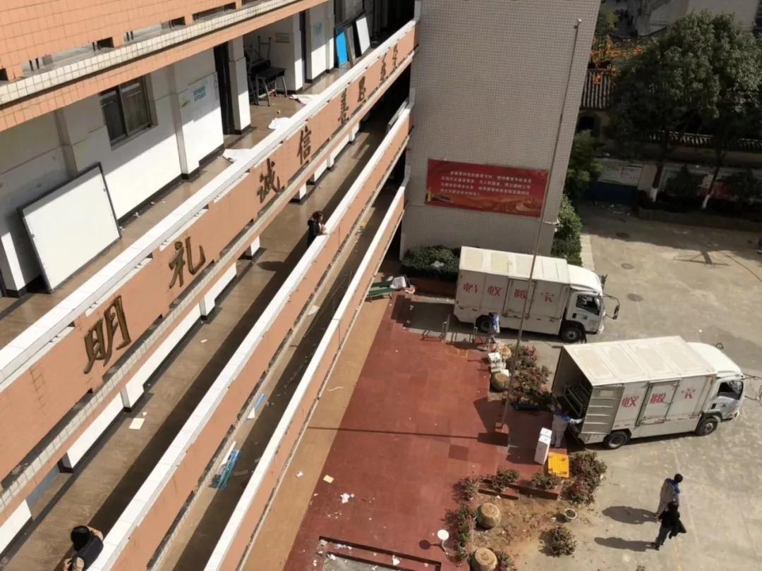 记者到达时,施工人员正在拆外墙的装饰,操场里停着两张搬家公司的车辆。学校的老师,往届毕业的学生纷纷到操场上、校门外拍照留念。