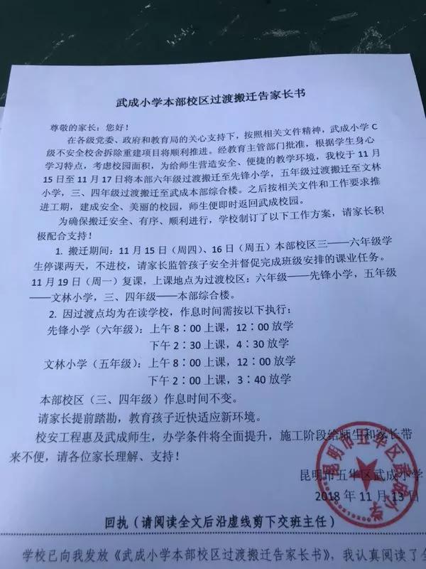 11月14日,五华区武成小学在微信公众号中宣布:学校于1983年建成的老教学楼即将拆除,原址重建。施工期间,学生分4地教学,一、二年级继续留在文化宫,三、四年级转到校内仍然保留的综合楼上课,五、六年级分别到文林小学和先锋小学借用教学场地。