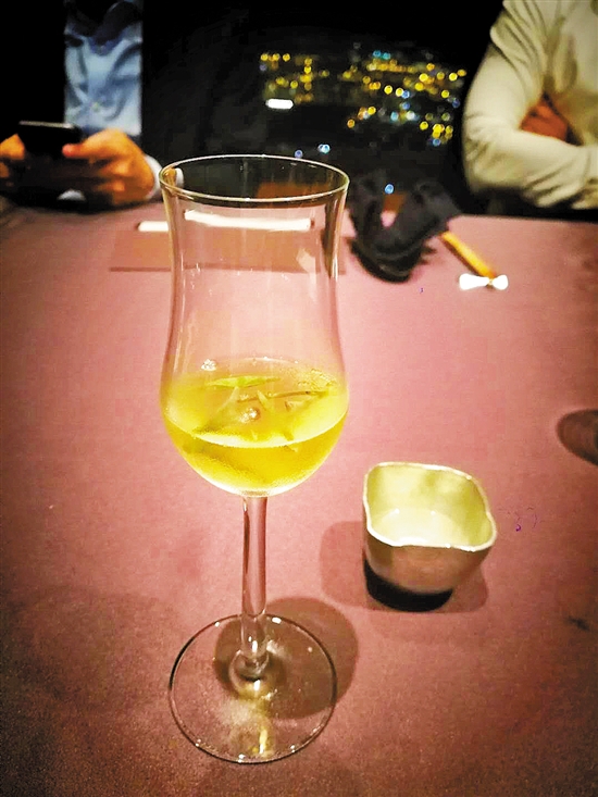 这两杯哪杯是酒哪杯是汤?对,香槟杯里的是番茄冻汤配莼菜。