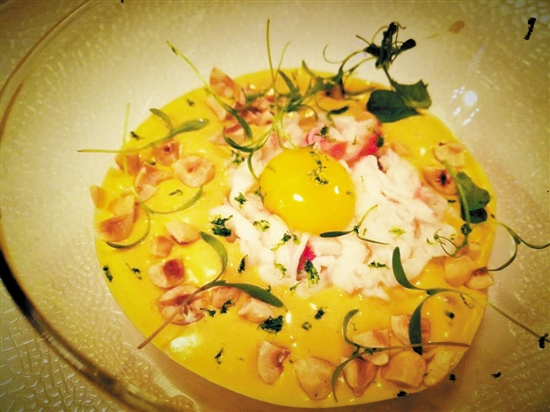 从蟹肉喇沙油封蛋黄,看法餐海鲜做法。