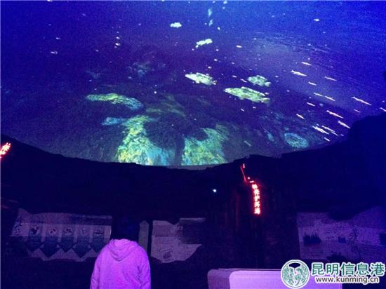 在“洱海保护”展厅,屋顶是个球体全景屏幕,通过设在房子正中的操控台,可以调取水质、水量资料;通过球体屏幕,跟随主人公的视角寻找弓鱼,以小见大,感受洱海被污染的过程和危机四伏的境况,感受面临失去母亲湖的切肤之痛。