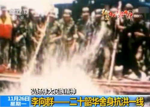 8月16日夜间,大雨再次瓢泼而至,李向群和战友们又冲上了大堤,此时部队已经连续奋战了10天,洪峰一个接着一个,大堤险情不断,官兵们毫无喘息之机。洪峰过去了,大堤保住了,在雨中奋斗了六个小时的李向群病倒了。8月20日晚上,李向群高烧到40度,头痛欲裂,第二天早上,他在头上勒了一根带子止痛,又到大堤上扛起了沙包。