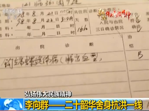 这是李向群住院时的病例,在病例中我们发现“钩端螺旋体”的字样,这是一种易在水和湿土中存活的致命性细菌,此时这种细菌已经严重侵蚀了李向群身体的多个器官,然而在汹涌咆哮的洪水面前,李向群仅仅把它当成了感冒。