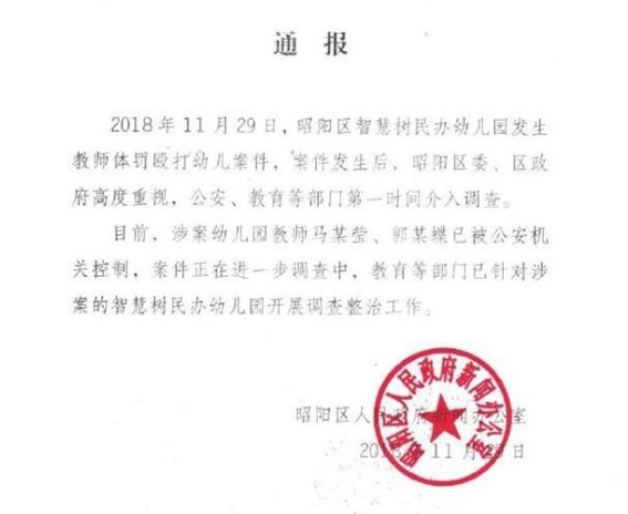 2018年11月29日,云南省昭通市昭阳区智慧树民办幼儿园发生教师体罚殴打幼儿案件,案件发生后,昭阳区委、区政府高度重视,公安、教育等部门第一时间介入调查。