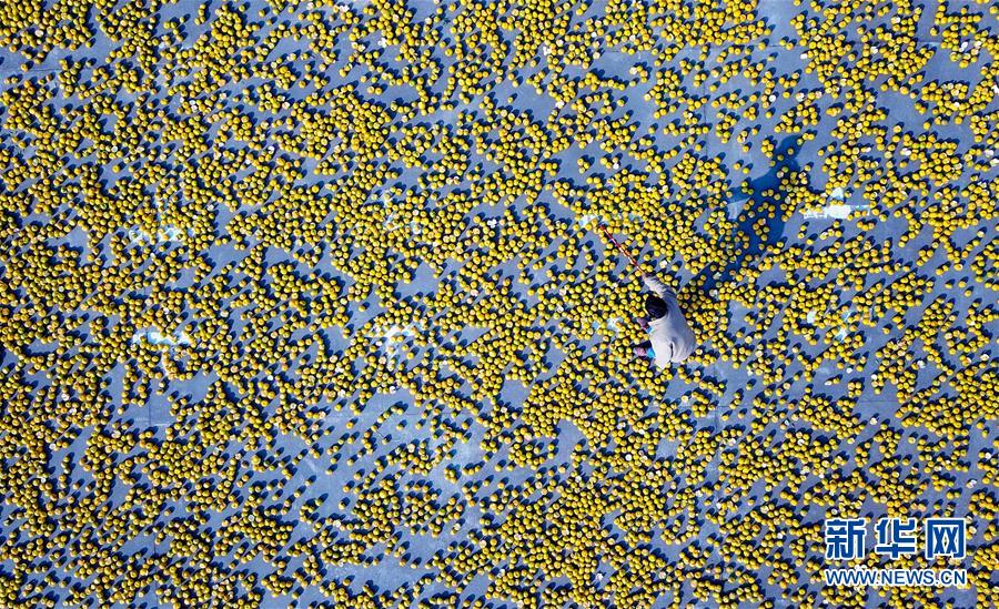 在江门市新会体育中心,一名工人在晾晒柑果果皮(11月29日无人机拍摄)。