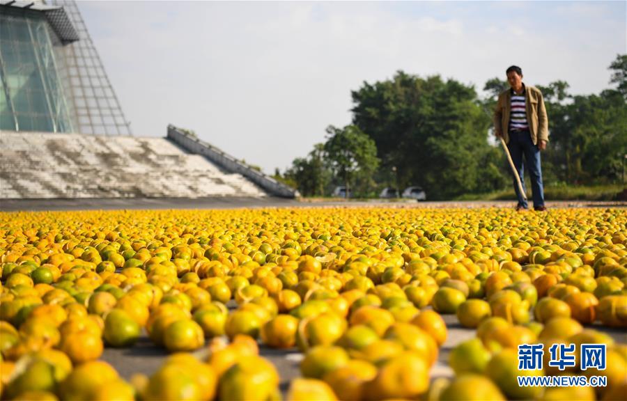 在江门市新会体育中心,一名工人在晾晒柑果果皮(11月29日摄)。新华社记者 邓华摄