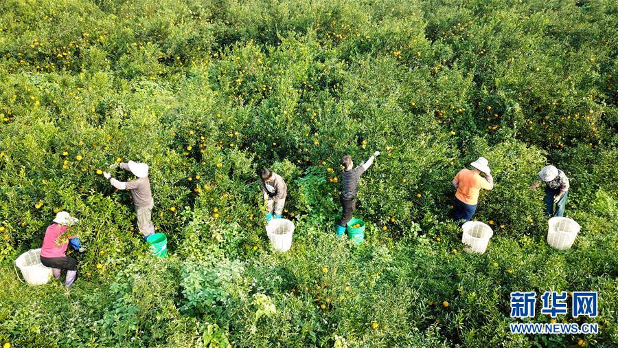 工人在采摘柑果(11月29日无人机拍摄)。新华社记者 邓华摄