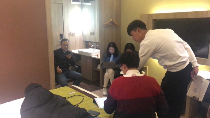 直播前夕,映客直播、斗鱼直播的工作人员聚在一起讨论脚本(人民网魏欣宁/摄)