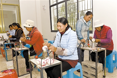 贫困群众在家门口的扶贫工厂务工。曹振华 摄