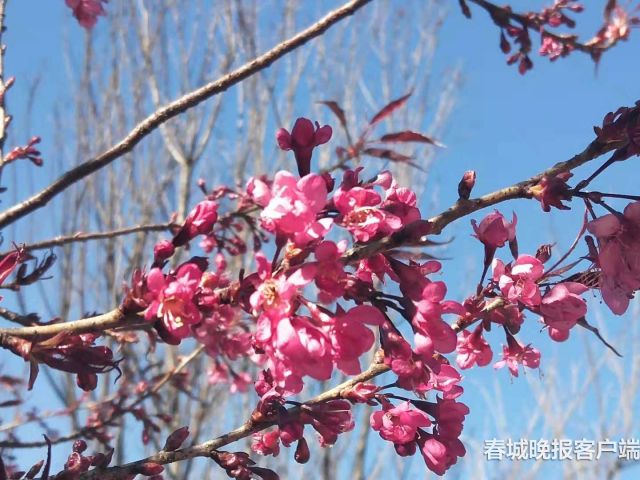 值得一提的是,复瓣云南红樱花在元旦前后,即可繁花一树,不畏霜冻,傲于寒冬。在中国人比较关注的时节,在灰白基调的背景中,以火红的颜色,为大家迎春送福。时节虽不是春天,却更似春天!