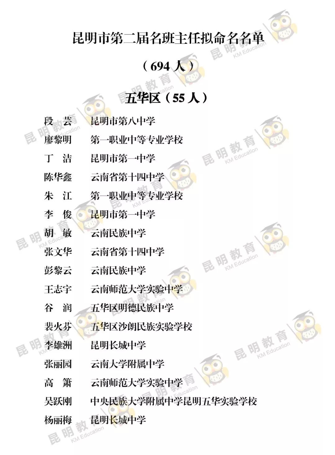 昆明信息港综合 12月4日,昆明市教育局网站公布了昆明市第二届名班主任拟命名名单,共694名教师上榜。