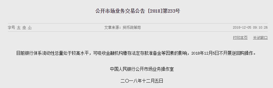 12月5日,央行发布公告称,目前银行体系流动性总量处于较高水平,可吸收金融机构缴存法定存款准备金等因素的影响,当日不开展逆回购操作。