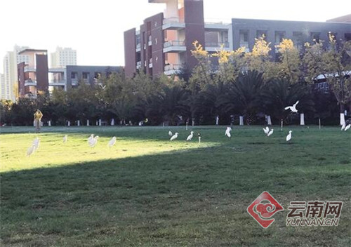 最近,有不少网友晒起了白鹭飞临校内的照片。记者走访证实,近几月,昆明理工大学呈贡校区图书馆面前的草坪上来了一群白鹭。据该校大三的李同学说:“差不多入冬以来,这些白鹭就每天都来,早上八九点的时候最多,有四五十只。学校来了白鹭,可能是因为昆明整体生态环境变好了,再加上学校的绿化比较好,所以就来了我们学校。”鸟协专家表示,白鹭为昆明留鸟,近年来,入城白鹭数量逐年增加,这与城区河道水质环境变好有很大关系。(春城晚报 记者刘嘉 实习生朱景芳)