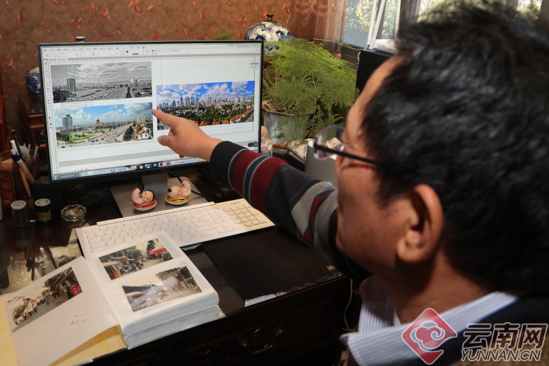 呈贡新区,张卫民正在电脑前整理着一本画册,每一页画面记录着近40年间昆明的城市面貌、规划建设和变迁印迹,他想把新老照片再进行对比疏理,为人们留下珍贵的影像资料。