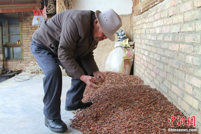 老人采集的柠条种子 李培源 摄