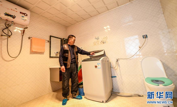 吉林延边光东村村民全得成在自家卫生间内使用洗衣机。(新华社 记者王昊飞/摄)