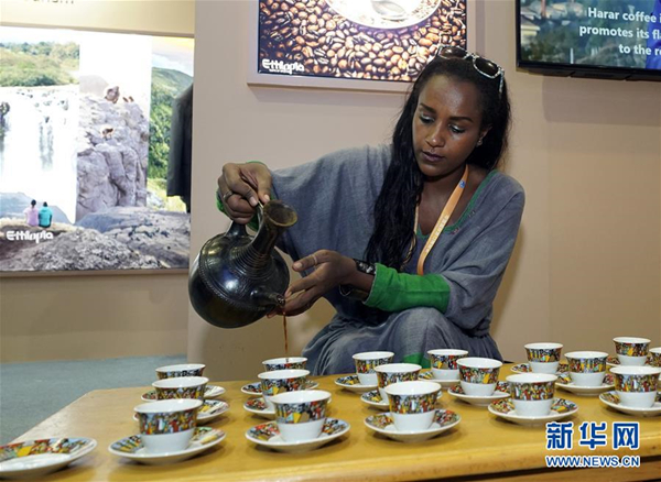 2018年11月6日,在首届中国国际进口博览会上,埃塞俄比亚参展人员为参观者倒咖啡。(新华社记者 沈伯韩/摄)