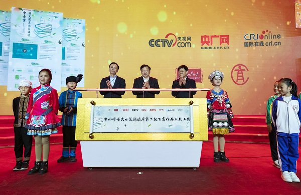 中央广播电视总台、教育部、国家语委联合举办“中小学语文示范诵读库”第二季作品发布会。中宣部副部长、中央广播电视总台台长慎海雄,教育部副部长、国家语委主任杜占元,中央广播电视总台副台长阎晓明出席发布会,并共同见证第二批100篇音频教材正式上线发布。新华社 记者沈伯韩/摄