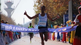 经过激烈角逐,中国运动员李从杰、钱家艳分别获得马拉松男子、女子第一名。