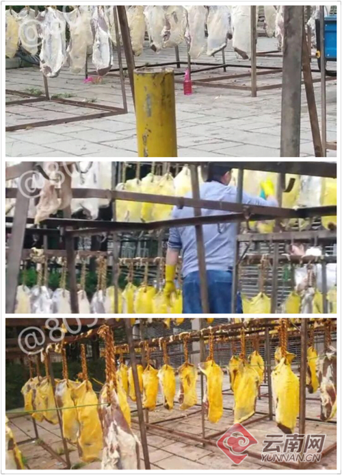 8月17日上午,昆明市西山区市场监督管理局获得舆情后,立即联合区公安分局等部门组织20余人的执法力量对媒体报道的情况进行了现场检查。为查明事实真相,防止不合格牛干巴流入市场危害消费者身体健康,该局依法对9户经营者现场正在晾晒的2585.5千克疑似染色牛干巴进行暂扣,并送至昆明明西兴冷链物流有限公司冷库进行保管。