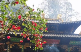 昆明金殿名胜区是全国著名的茶花观赏园,眼下正值金殿名胜区第三十一届茶花展之际,早牡丹、早桃红、雪娇等上百种云南山茶和外国茶花的早开品种已进入盛花期,把金殿装点得姹紫嫣红,其中古山茶“殿前红”成为当之无愧的山茶王。已有400多年树龄的“殿前红”是最著名的云南古山茶,其品种为“狮子头”,花型大、数量多、色泽艳,花开时节红艳似火,与历史悠久的金殿交相辉映,而得“殿前红”美名。