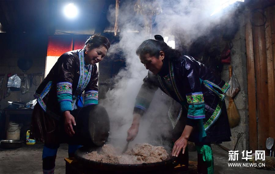 1月5日,在广西融水苗族自治县杆洞乡尧告村,村民在制作糯米饭。 新华社记者黄孝邦/摄