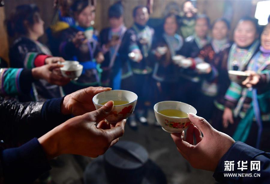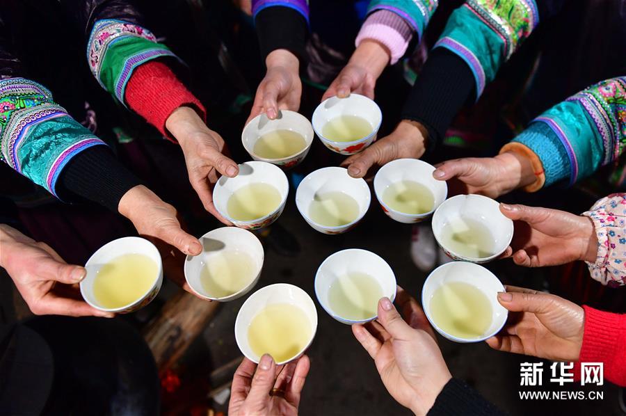 1月5日,在广西融水苗族自治县杆洞乡尧告村,村民们在聚会中喝“吉祥酒”。“吉祥酒”是苗族群众最喜欢的传统饮料,是苗族人为重大节日准备的。 新华社记者黄孝邦/摄