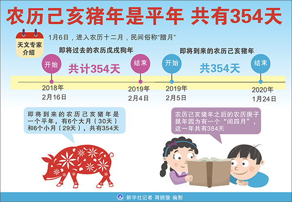 新华社天津1月6日电 记者周润健 6日,进入农历十二月,民间俗称“腊月”,腊八飘香,年味渐浓,农历己亥猪年的脚步也越来越近。天文专家表示,同即将过去的农历戊戌狗年一样,农历己亥猪年也是一个平年,共有354天。