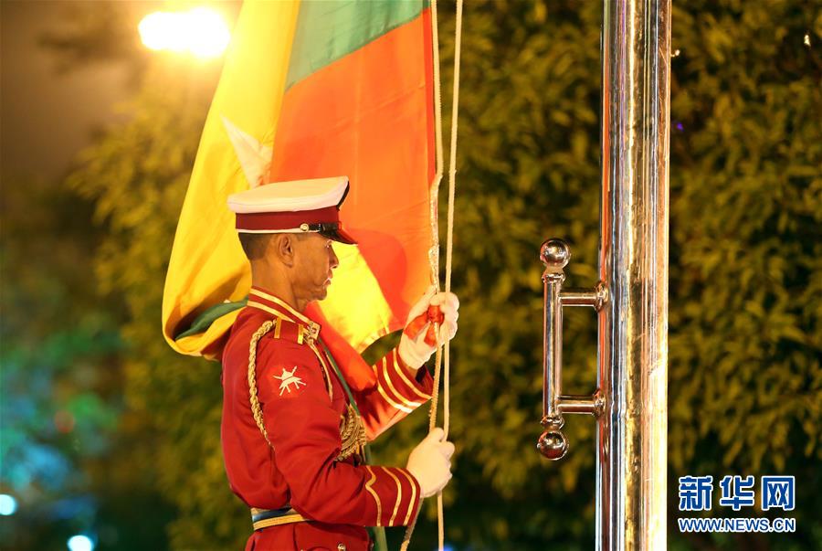 1月4日,在缅甸内比都,一名军人在升旗仪式上准备升旗。 缅甸4日举行活动,庆祝独立71周年。 新华社发(吴昂摄)