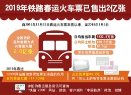 记者从中国铁路总公司获悉,自2018年12月23日发售春运第一天车票,至2019年1月6日以来,网上网下各种售票方式运行平稳有序,全国铁路各种售票方式共售出车票2亿张,日均售出车票1332.3万张,日均同比增加189.5万张,增幅近17%,单日售票量屡创新高。