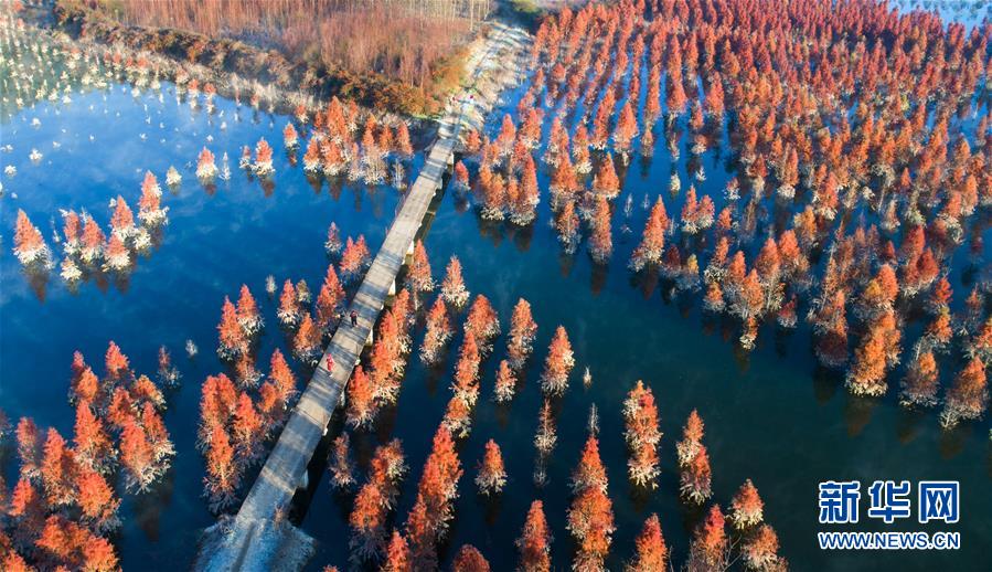 游人在甸尾村水杉湿地游玩(1月5日无人机拍摄)。新华社记者 秦晴/摄