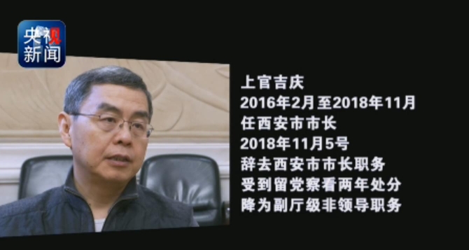 上官吉庆,2016年2月至2018年11月任西安市市长,2018年11月5号辞去西安市市长职务,受到留党察看两年处分,降为副厅级非领导职务。