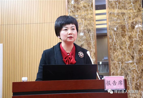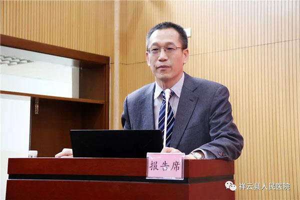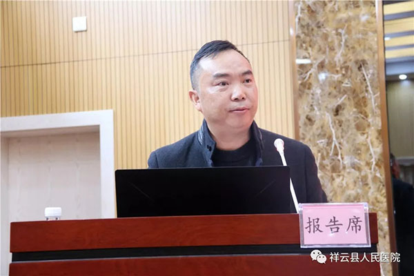 祥云县人民医院党委书记、院长杨兆伟讲话。他说,祥云县人民医院高度重视创伤中心建设工作,目前已取得阶段性成效,创伤救治流程进一步优化,救治时间逐渐缩短,逐步提高了创伤救治水平。
