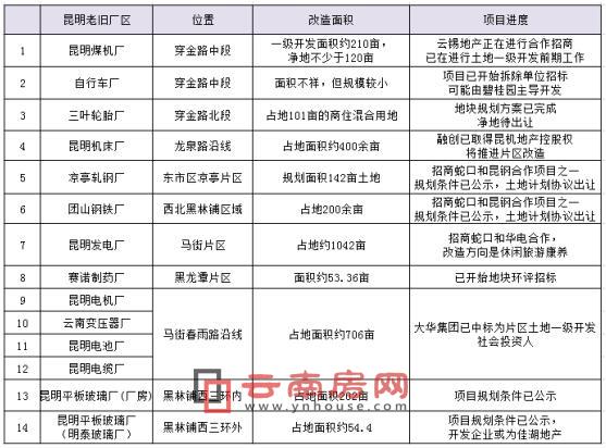 10年前,昆明市提出“退二进三、工业入园”的政策后,昆明城区内的老工厂就开始陆续搬迁改造, 逐渐停产的老厂区有改造成文创园区的,也有开发成房地产项目的。最近两年,昆明主城区老旧厂区的改造明显提速,据云南房网不完全统计,截至2018年底,又有10多个旧厂区启动改造或接近完成土地供应,昆明煤机厂、穿金路自行车厂、穿金路三叶轮胎厂、昆明机床厂、凉亭轧钢厂、团山钢铁厂、昆明平板玻璃厂、明泰玻璃厂、昆明发电厂、赛诺制药厂、昆明电机厂、云南变压器厂、昆明电池厂、昆明电缆厂等10多个老厂区都将陆续被开发成房地产项目,总计规模约3000余亩。