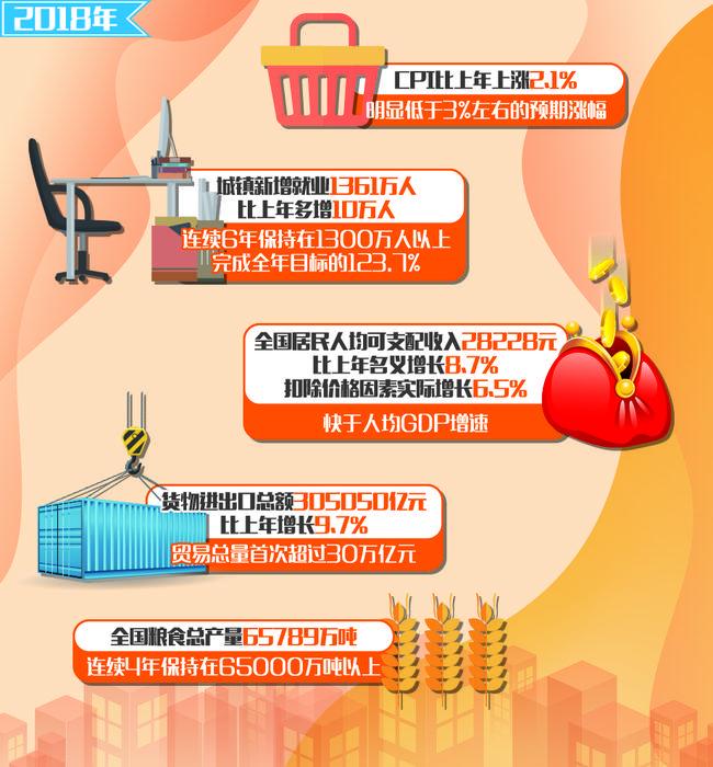 2018年,CPI比上年上涨2.1%,就业完成全年目标的123.7%,全国居民人均可支配收入快于人均GDP增速