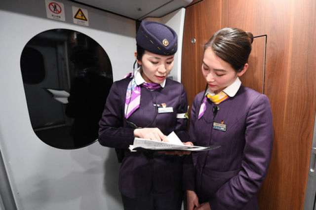 薛峰(左)和乘务员交流车内情况(1月18日摄)。新华社 记者李博/摄