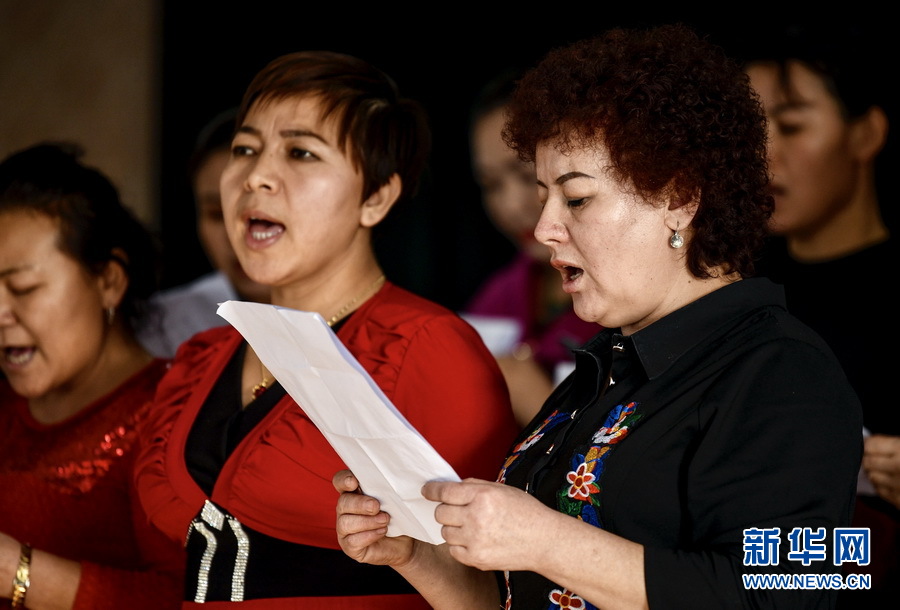 热孜古丽·哈力克(左一)练习演唱歌曲。新华社 记者王菲/摄