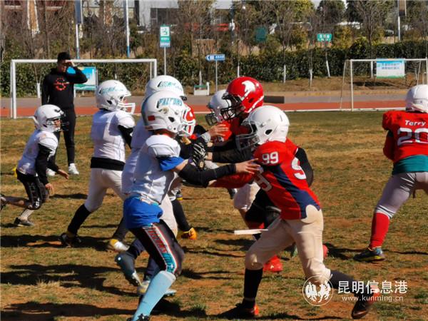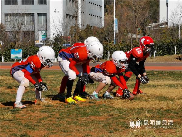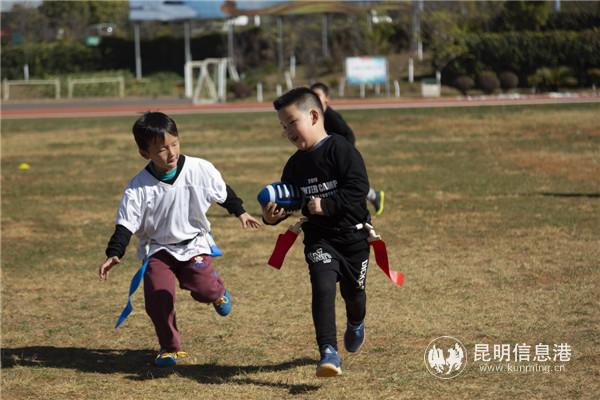昆明信息港讯 记者栗飞 1月27日下午,昆明首场少儿橄榄球比赛在经开春天体育场启动,来自成都、重庆、广州、东北和昆明的40多名橄榄球“小运动员”齐聚一堂,参加这场别具一格的竞赛。