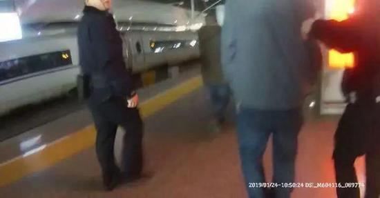 贡旭果断拦住男子去路,在旅客的协助下,将他控制在列车车厢背向站台的一侧车门。
