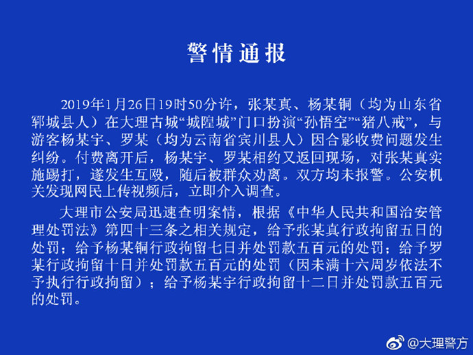 1月28日下午,记者从大理市公安局获悉,1月26日19时50分许,张某真、杨某铜(均为山东省鄄城县人)在大理古城“城隍城”门口扮演“孙悟空”“猪八戒”,与游客杨某宇、罗某(均为云南省宾川县人)因合影收费问题发生纠纷。付费离开后,杨某宇、罗某相约又返回现场,对张某真实施踢打,遂发生互殴,随后被群众劝离。双方均未报警。公安机关发现网民上传视频后,立即介入调查。