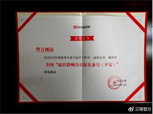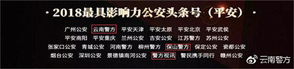 昆明信息港讯 记者合宇聪 日前,“今日头条”通过对全部政务头条号、政务抖音号的综合评估,评出了2018年度政务头条号、2018年度政务抖音号、2018年度最佳政务抖音短视频。其中,云南省公安厅官方头条号“@云南警方”、保山市公安局官方头条号“@保山警方”、昆明市寻甸县公安局官方头条号“@警方视讯”获评2018全国“最具影响力公安头条号”。