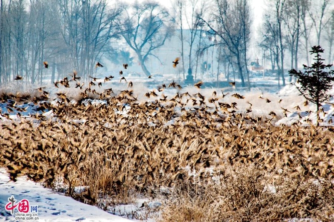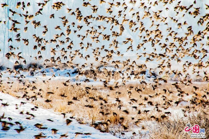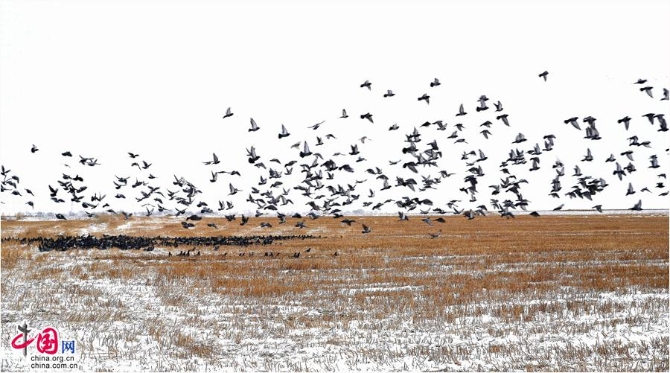 这个冬天鸟很多,熙熙攘攘在祁连山下群居,飞翔,成了一道风景。