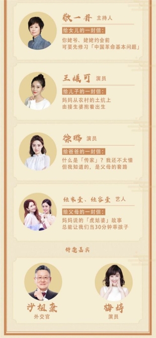 未来一个月中,参加《春节家书》活动并录制音频的还将有著名学者周国平、钱文忠,联合国前副秘书长沙祖康,青年演员欧阳娜娜、任家萱、梅婷、任容萱等,其他嘉宾也会陆续参与进来。他们或是在信中娓娓道来儿时父母趣事,或是语重心长地为子女指引人生的方向。
