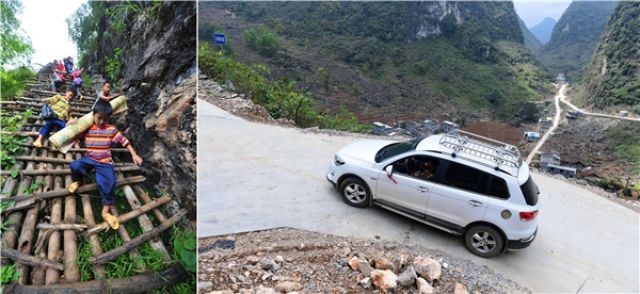 右图:修通水泥路之后,弄顶屯的家长开着汽车去学校接孩子回家。(新华社记者黄孝邦摄·2017年)。