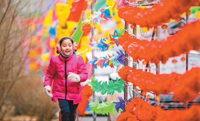 春节将至,内蒙古呼和浩特市玉泉区的广场、公园处处洋溢着红红火火的年味。图为2日,小朋友在玉泉区通顺大巷的彩灯墙旁游玩。丁根厚摄(人民视觉)