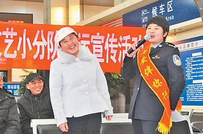 为了给回乡旅客营造更温馨舒适的出行环境,大同铁路公安处文艺轻骑兵小分队近日带着精心编排的文艺节目走入车站候车室,为旅客带去欢笑和温暖。任军/摄