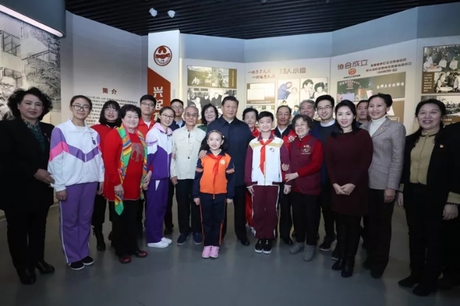 2019年1月17日上午,在天津市和平区新兴街朝阳里社区,习近平走进社区志愿服务展馆。社区志愿者们见到总书记十分激动,纷纷讲述自己的“志愿故事”。习近平为社区志愿者们点赞,称赞他们是为社会作出贡献的前行者、引领者。