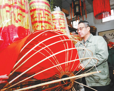 北京市美术红灯厂工人将红色布料贴在骨架上。